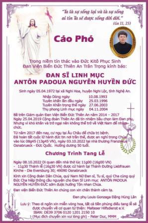 Hôm rồi khi được các bạn hữu bên Đức báo cho biết ngài qua đời, tôi không ngạc nhiên vì tôi đã thấy thể trạng của ngài sau khi bị đầu độc. Tôi nghĩ may mà ngài được các bác sĩ ở Đức tận tình cứu chữa chứ nếu ở nước khác có lẽ ngài đã qua đời từ lâu rồi! Dù sao thì tôi biết biết ngài đã chiến đấu đến cùng để duy trì sự sống của mình cũng như bảo vệ sự tồn tại của Đan viện Thiên An mà ngài hằng yêu mến hơn cả tính mạng mình. Ngài là một đan sĩ thực thụ, một con người của cầu nguyện và làm việc như châm ngôn của Thánh Tổ phụ Biển Đức.