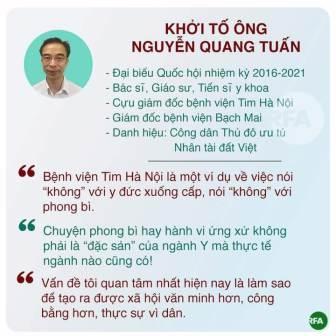 Giám đốc Bệnh viện Bạch Mai ở Hà Nội, ông Nguyễn Quang Tuấn, sinh năm 1967, bị Viện Kiểm Sát Nhân dân Tối cao khởi tố tội ‘vi phạm qui định đấu thầu gây hậu quả nghiêm trọng ‘ theo Điều 222 Bộ Luật Hình sự Việt Nam năm 2015, sửa đổi năm 2017.