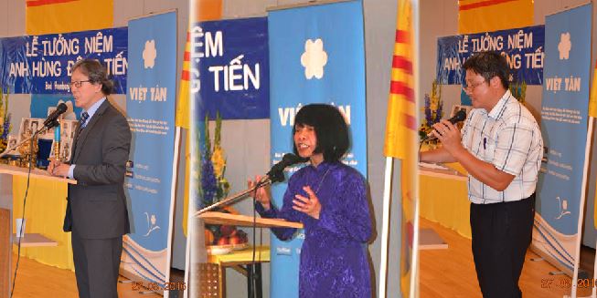 Ông Phạm Công Hoàng, bà Đỗ Lan, hai thân hữu sát cánh với cơ sở VT tại Đức suốt nhiều năm trường đã được mời lên phát biểu cảm tưởng về những anh hùng Đông Tiến. Bà Lan đã rất xúc động khi tâm sự cùng cử tọa.