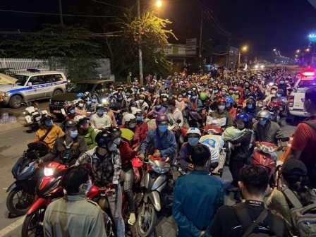Khuya 30.9, tại quốc lộ 1 (khu vực thị trấn Tân Túc, huyện Bình Chánh, TP.HCM) giáp ranh tỉnh Long An, rất đông người dân đi xe máy tự phát về quê vẫn đang vạ vật, chờ đợi với hi vọng được cho qua. Đến khuya, dù đã qua ngày 1.10, vẫn còn hàng trăm người dân tập trung tại chốt kiểm soát trên Quốc lộ 1 đoạn qua địa bàn thị trấn Tân Túc (huyện Bình Chánh, TP.HCM) mong được qua chốt để về quê ở các tỉnh miền Tây.